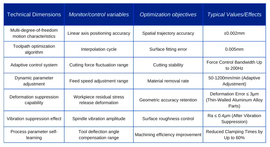 During machining, the adaptive control system dynamically adjusts feed rates and tool deflection angles by acquiring cutting forces, vibration signals, and workpiece deformation data in real time.