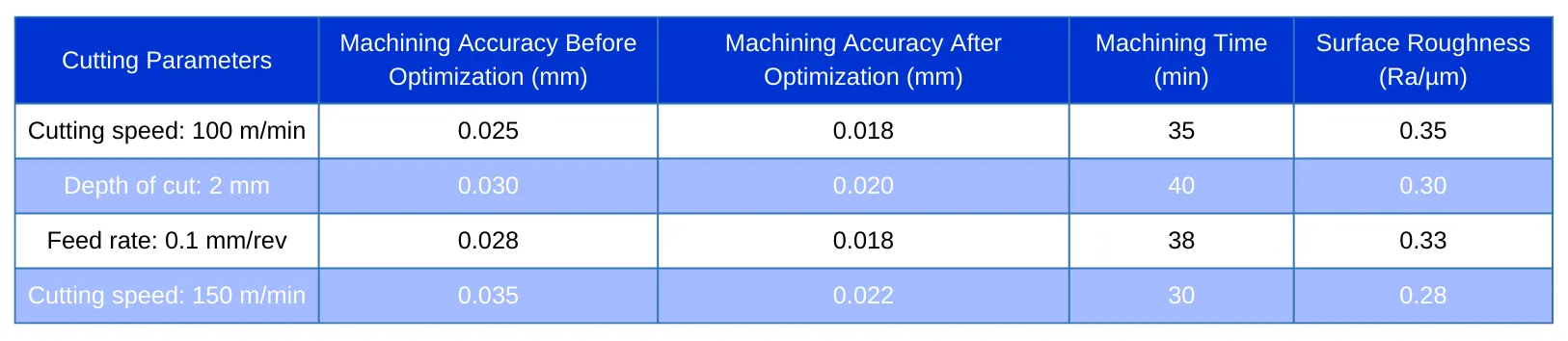 For instance, setting the cutting speed to 100m/min machining accuracy improves from 0.025 mm to 0.018 mm, while surface roughness shows a decreasing trend.