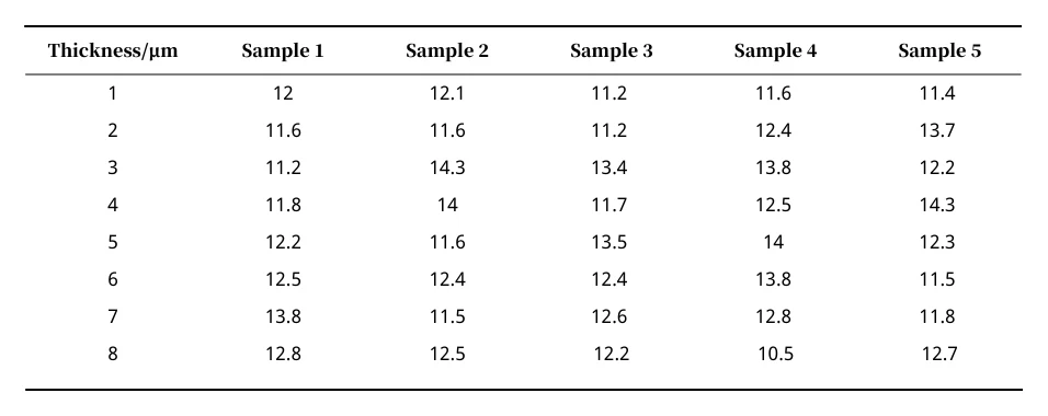 When measuring film thickness using an eddy current thickness gauge, the results are shown in Table 1 below.