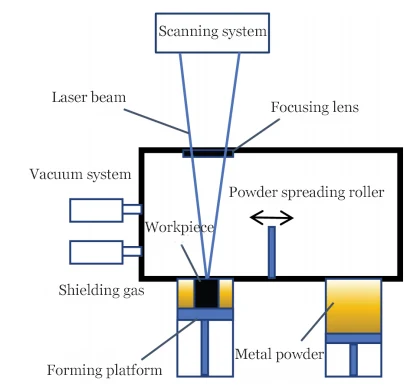First, a layer of metal powder is evenly spread over the build platform (substrate).